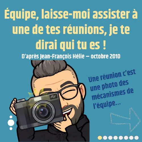 Jean-François Hélie, spécialiste de la facilitation, souligne que plusieurs aspects des réunions sont en résonance directe avec la réalité d'un projet, tels que :